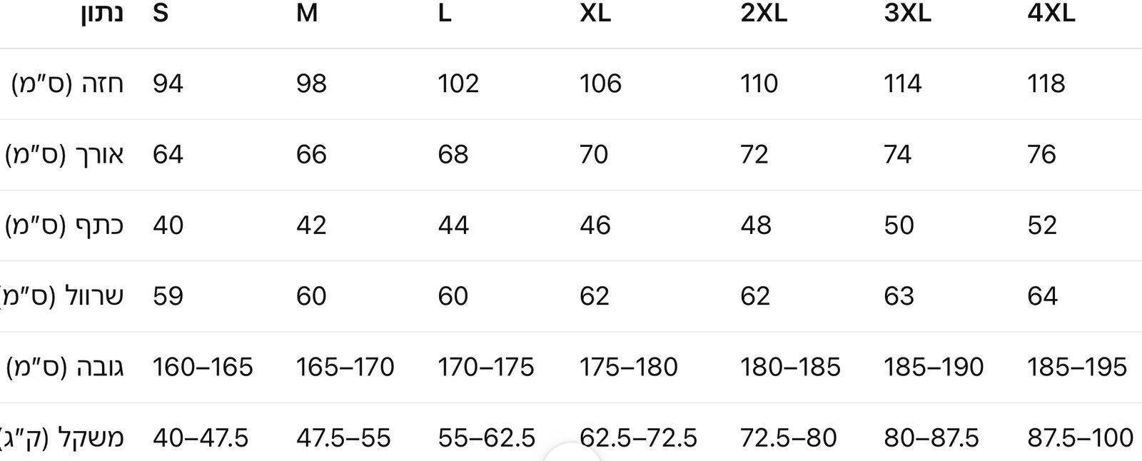 S, M, L, XL, 2XL, 3XL, 4XL