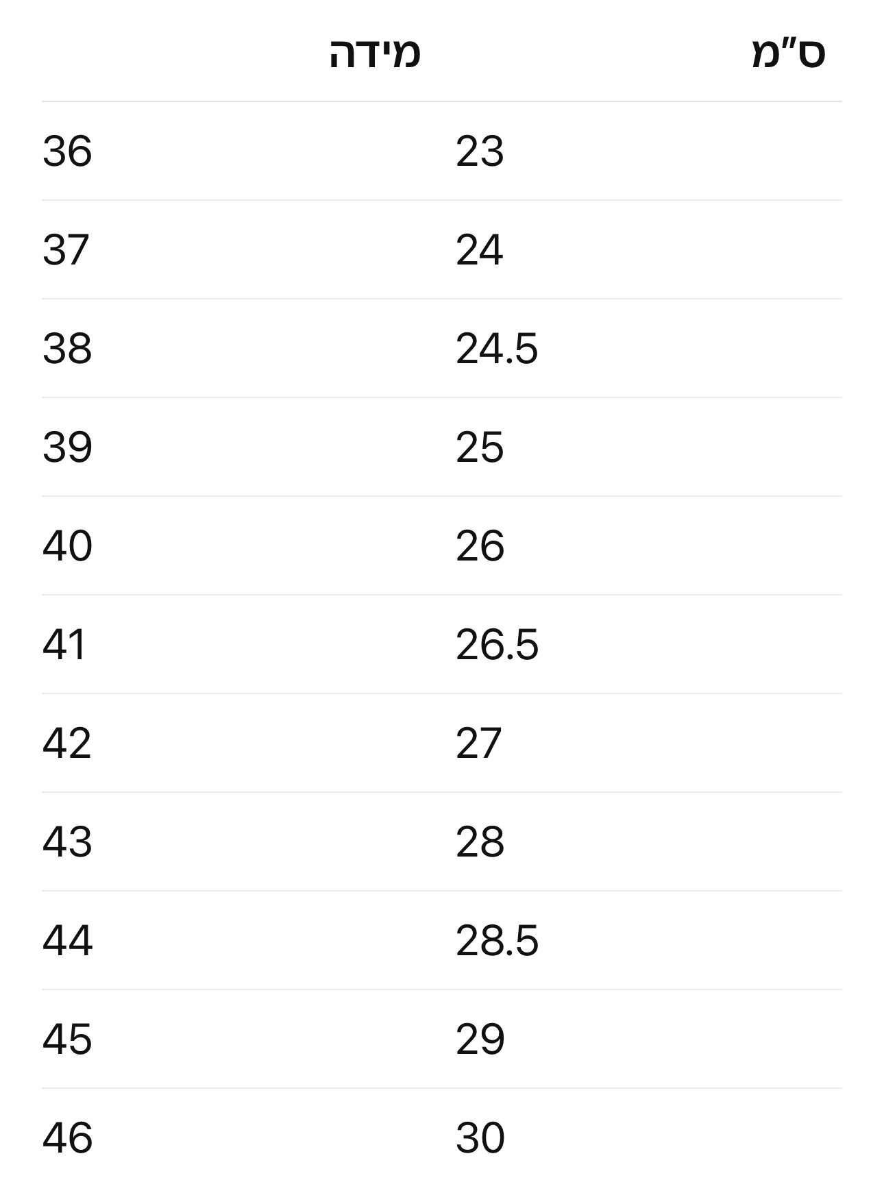 | מידה | 35, 36, 37, 38, 39, 40, 41, 42, 43, 44, 45 |