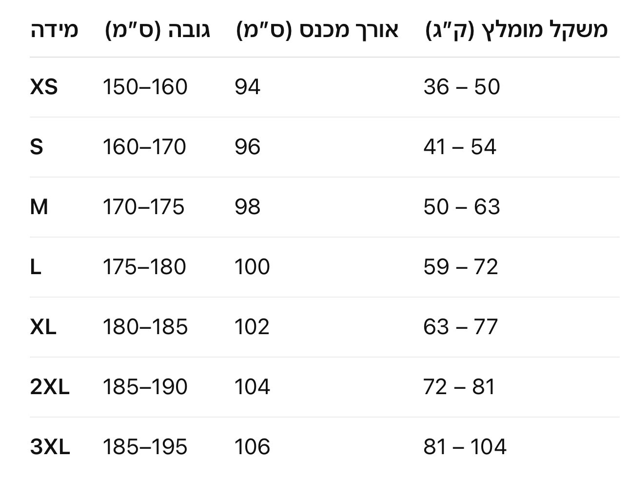 XS, S, M, L, XL, 2XL, 3XL