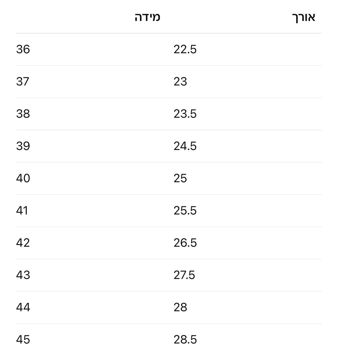 | מידה | 36, 37, 38, 39, 40, 41, 42, 43, 44, 45 |