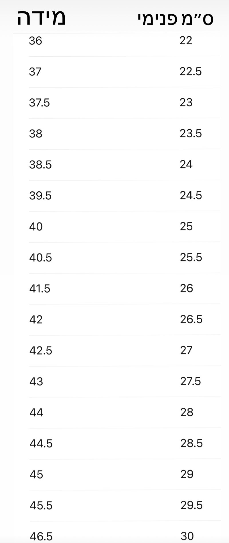 | מידה | 36, 37, 38, 39, 40, 41, 42, 43, 44, 45, 46, 46.5 |