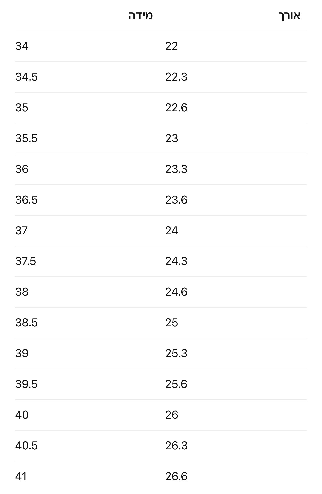 | מידה | 33, 34, 35, 36, 37, 38, 39, 40, 41 |